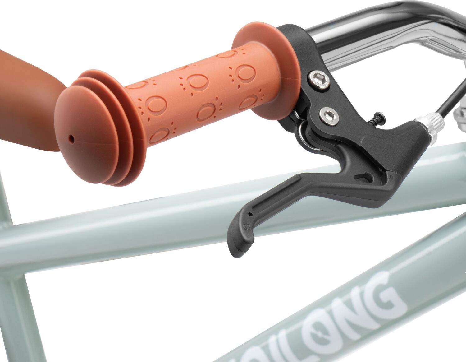 - Ручки керма м'які, гумові, з бічним захистом рук у разі падіння. Ручне гальмо, V-Brake на передньому і барабанний механізм на задньому гарантують надійне гальмування.