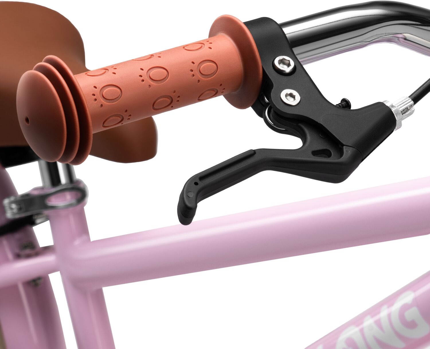 - Ручки керма м'які, гумові, з бічним захистом рук у разі падіння. Ручне гальмо, V-Brake на передньому і барабанний механізм на задньому гарантують надійне гальмування.