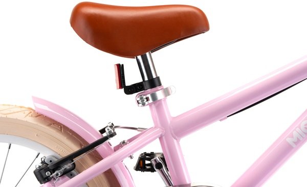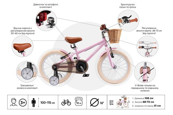 Кермо і сидіння регулюються за висотою в широкому діапазоні. Сидіння м'яке, з покриттям з ECO-шкіри. Гріпси керма м'які гумові, з бічним захистом рук у разі падіння. Ручне гальмо V-Brake і на передньому, і на задньому колесі забезпечать надійне гальмування. Диск колеса 16` традиційний, спицевий з класичною втулкою на підшипниках. Високий і широкий профіль покришки забезпечать комфортне катання як по асфальту, так і по нерівностях. Колеса додатково захищені бризговиками, пофарбованими в колір велосипеда, що надійно захистять від бруду та бризок.