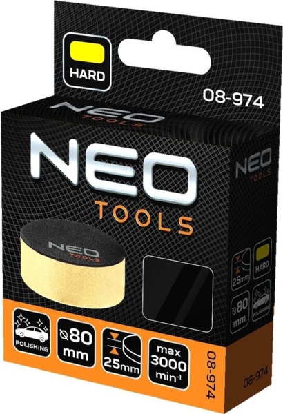 Полірувальний диск Neo Tools розміром 80x25 мм призначений для використання з ротаційними та ексцентриково-ротаційними полірувальними машинами. Він виготовлений з пінополіуретану, що забезпечує м'яке та ефективне полірування. Кріплення на липучці дозволяє швидко та легко замінювати диски.