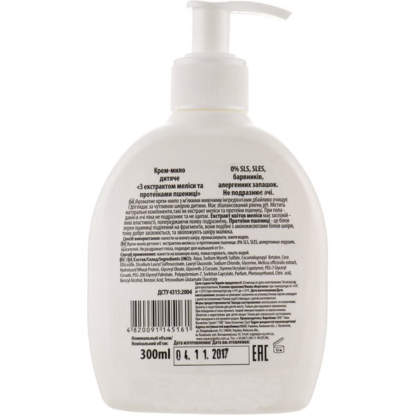 Ароматне крем-мило з м'якими миючими інгредієнтами дбайливо очищає та доглядає чутливу шкіру дитини. Має збалансований рівень рН. Містить натуральні компоненти, такі як екстракт меліси та протеїни пшениці. При влученні у вічі піна не дратує і не щипає. Екстракт квіток меліси має заспокійливі властивості, попереджаючи появу подразнень. Протеїни пшениці – це білок зерен пшениці розділений на фрагменти, вони подібні до амінокислот білків шкіри тому добре засвоюється, і зволожують шкіру малюка.