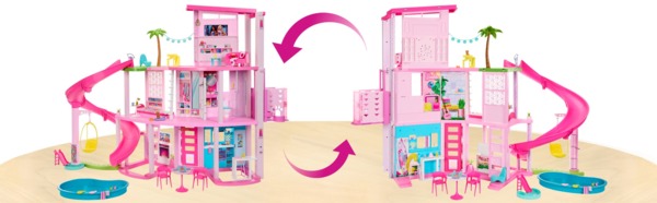 Ласкаво просимо до Будинку мрії Barbie, де будь-які фантазії перетворюються у реальність. Оновлена версія культового лялькового будиночка має відкриту конструкцію, першокласне оформлення та більш ніж 75 предметів для гри. Будинок облаштований 10 ігровими зонами, в кожній з яких дитяча уява має безліч можливостей для створення історій. Всередині є кухня, їдальня, вітальня, спальна кімната, ванна, гардероб, зала та відкрита тераса, на якій діти можуть влаштовувати вечірки. Щоб підняти ляльок на другий та третій поверхи, діти можуть використовувати робочий ліфт. А як захочеться більше емоцій, можна спробувати з’їхати великою спіральною гіркою, що веде з верхнього поверху одразу на зовнішнє подвірʼя, де встановлений басейн. Винятковим будинок роблять підсвітка й звукові ефекти в кухні та ванній кімнаті.