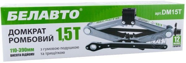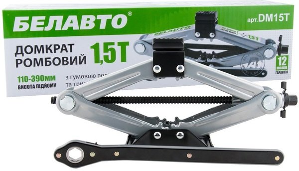 - Домкрат Belauto Ромбовий 1,5т. з тріскачкою, гумова подушка, вис. підйому 110-390мм. (DM15T)