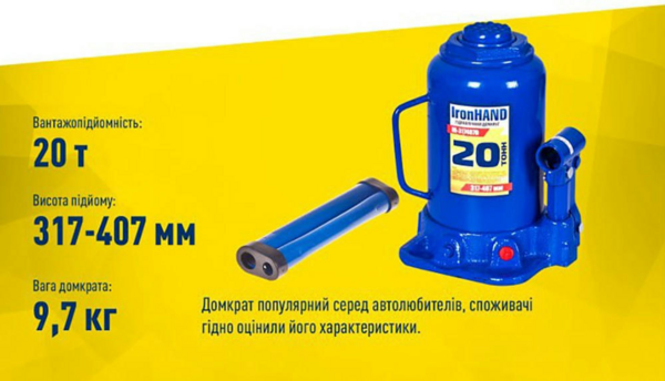 Відгуки та питання про Домкрат Iron Hand гідравлічний 20т 217-407мм (IH-317407D)