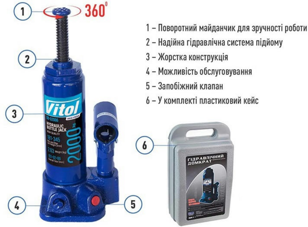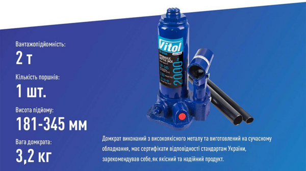Опис Домкрат Vitol гідравлічний 2т 181-345мм (DB-02006K)
