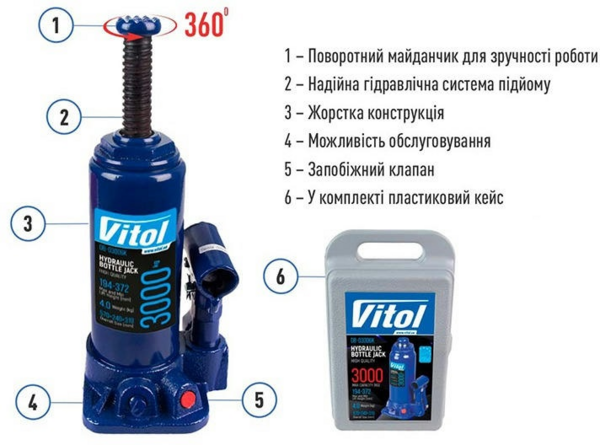 Опис Домкрат Vitol гідравлічний 3т 194-372мм (DB-03006K)