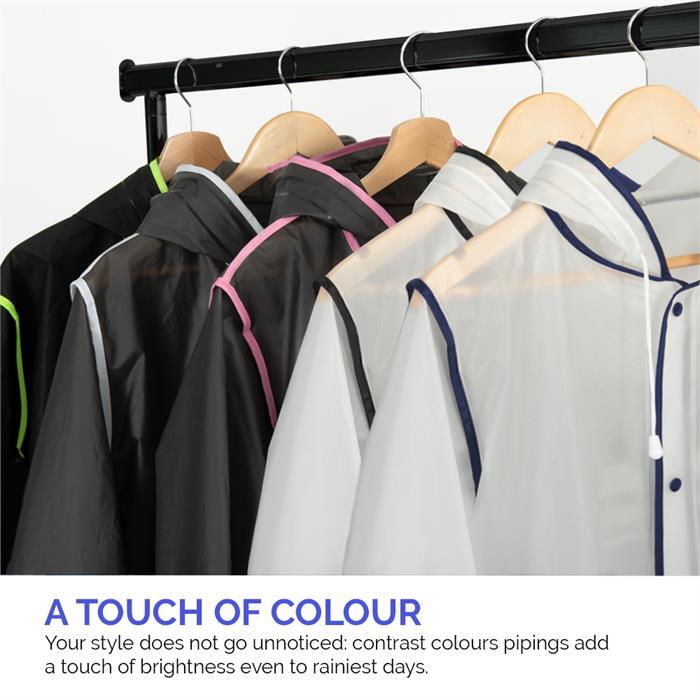 Водонепроникний напівпрозорий тренч Perletti має чорну окантовку. Це ідеальний одяг для прогулянок у дощову погоду, екскурсій у гори або на природу. Під ним ви залишитеся сухим навіть під час зливи. Це чудова альтернатива парасольці.