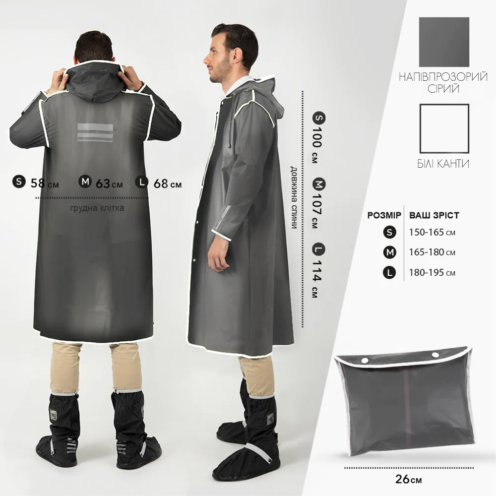 - Для підвищення безпеки плащ має на спині та рукавах сітловідбивні деталі, які роблять людину в дощовику помітною у світлі фар;