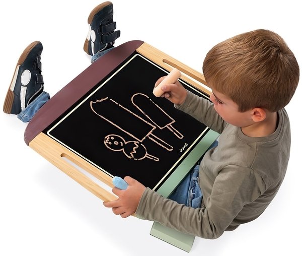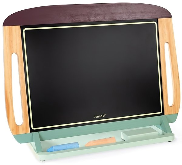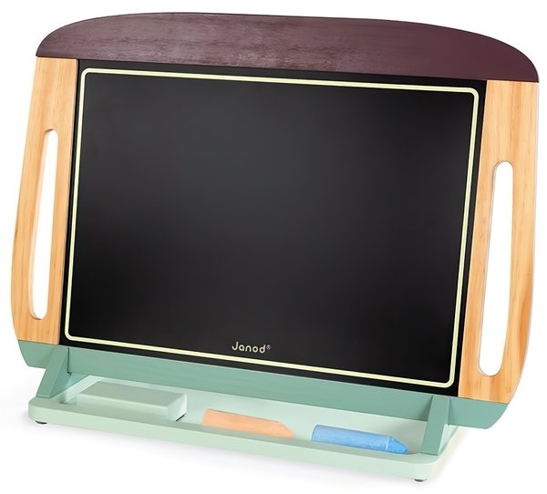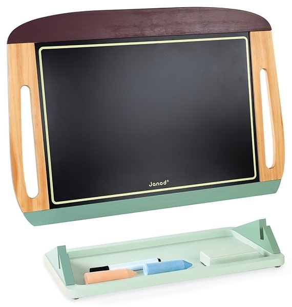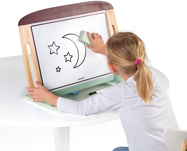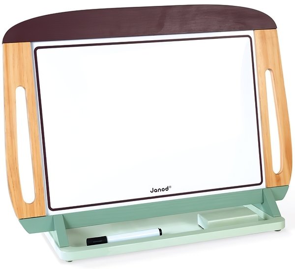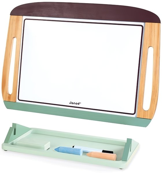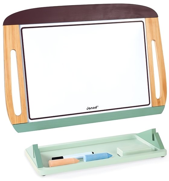 Відмінна двостороння портативна дошка для малювання. Її легко переносити і розміщувати завдяки нековзною опорі. Одна сторона – це типова чорна дошка для крейди, а інша – біла стирається маркерна дошка. Включає 2 товстих крейди, 1 маркер і ластик. Ця дерев'яна дошка дозволить вашій дитині висловити свою творчість на двох поверхнях.