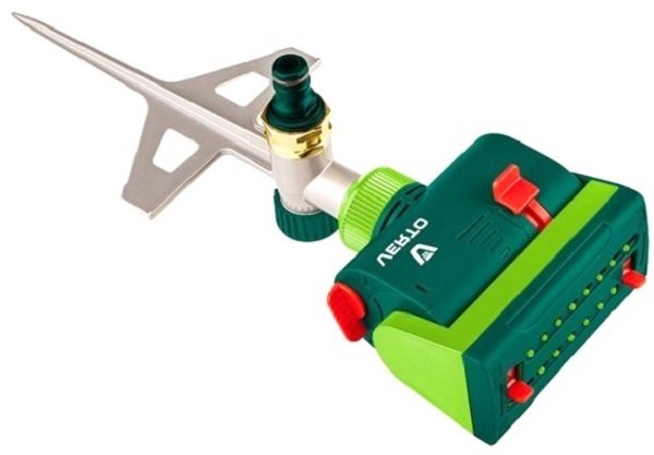 Удобный ороситель фирмы Верто 15G773 увидел недавно у своего соседа. Маятниковая конструкция дает возможность поливать одновременно большой участок газона. Очень советовал он приобрести такую модель, я заказывал через интернет вместе в другими товарами для сада в этом магазине. Устанавливается просто, подходит для многих видов шланг, если даже по диаметру будут отличия, переходники всегда доступны в любой точке продажи подобного вида девайсов. Благодаря металлическому штырю, который глубоко проникает в землю, фиксируется устройство надежно, обеспечивается правильное распределение воды над поверхностью.