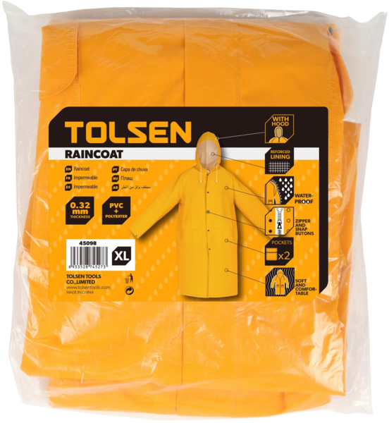 Дощовик Tolsen, ХXXL, ПВХ-матеріал 0,32мм, водонепроникний, жовтий (45100)Дощовик Tolsen, ХXXL, ПВХ-матеріал 0,32мм, водонепроникний, жовтий (45100)