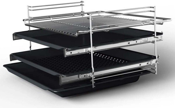 Наша система телескопічних напрямних безпечна та проста у використанні. На рівні, оснащеному телескопічними рейками, розмістити деко зі стравою набагато легше. Вам більше не потрібно тягнутися до гарячої духовки руками, аби швидкої перевірити стан приготування.