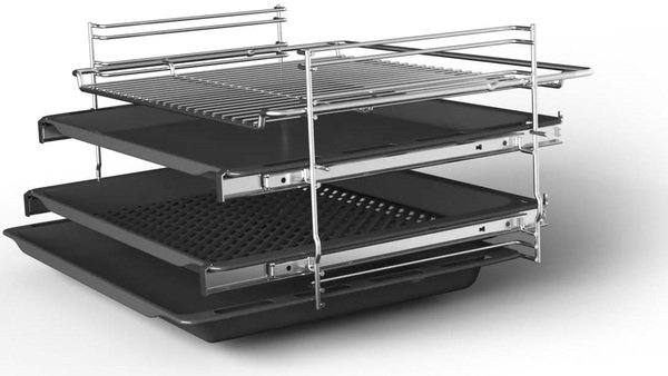 Наша система телескопічних напрямних безпечна та проста у використанні. На рівні, оснащеному телескопічними рейками, розмістити деко зі стравою набагато легше. Вам більше не потрібно тягнутися до гарячої духовки руками, аби швидкої перевірити стан приготування.