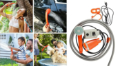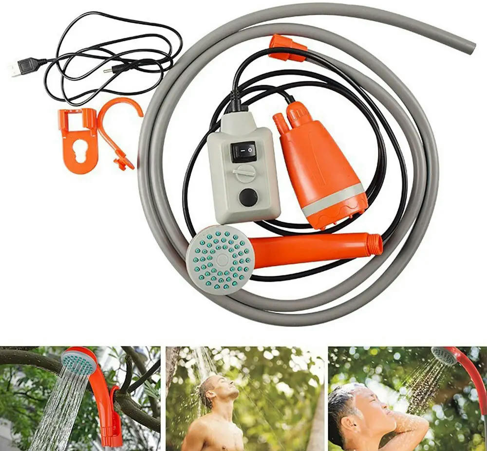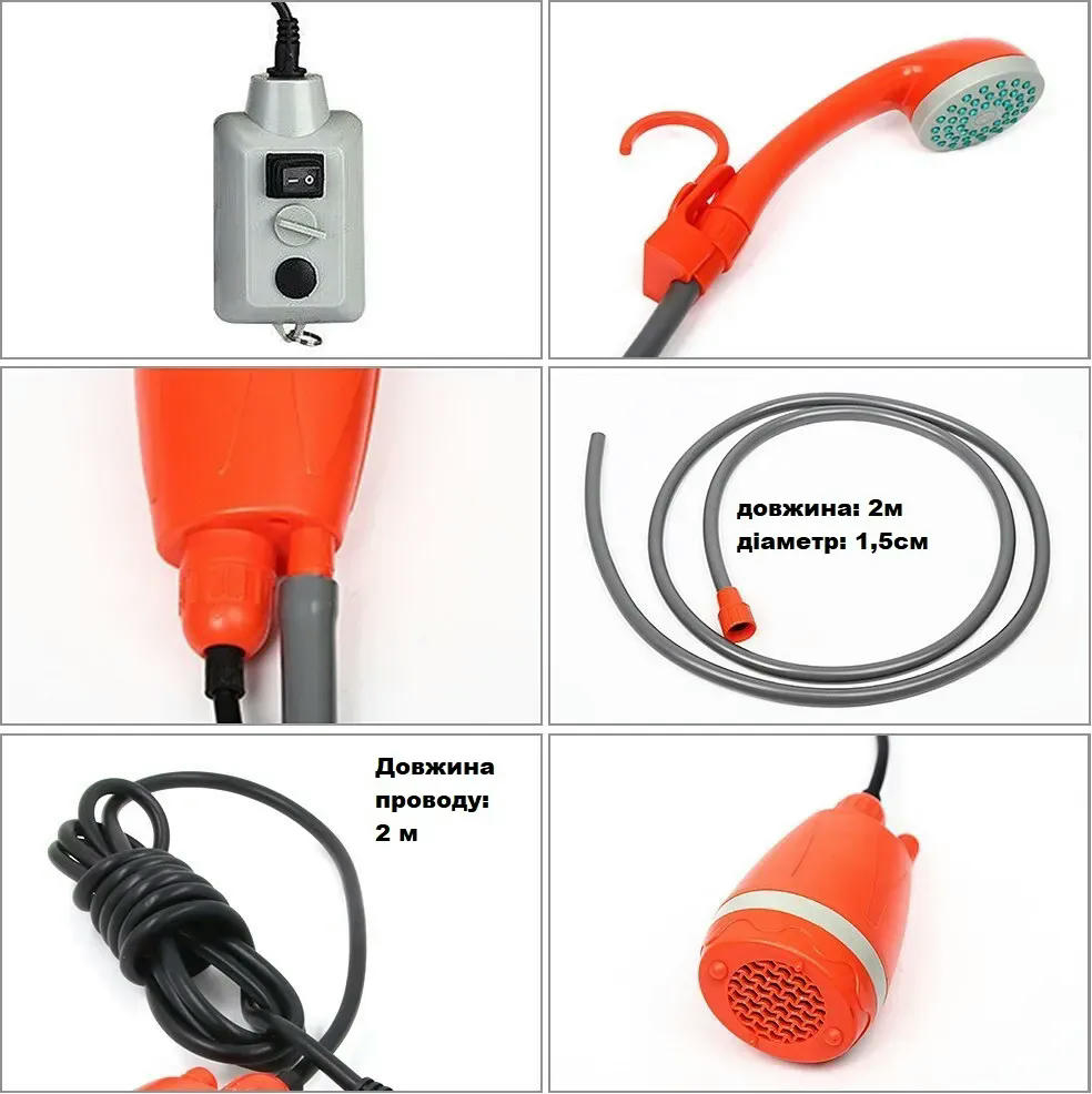 - Простота в експлуатації: збірка займає не більше трьох хвилин. Під’єднайте шланг, занурте насос у ємність з водою і натисніть кнопку живлення — і душ готовий до використання.