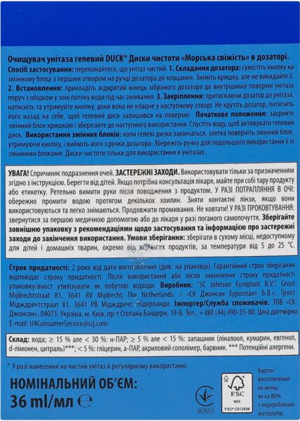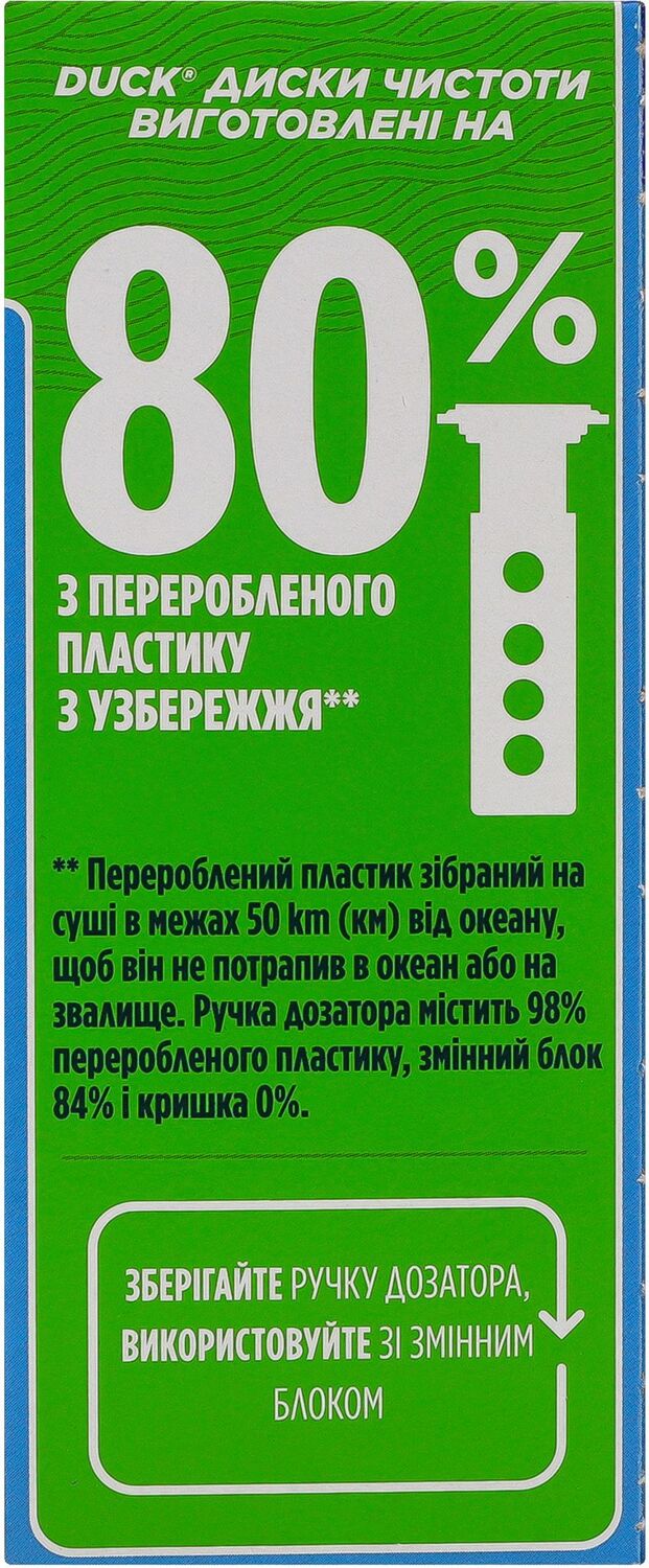 Ви любите чистий туалет, але ненавидите його чистити? Звичайно, що так. Добре, що є Duck — гелеві диски, які самостійно приклеюються до унітазу і забезпечують повне очищення при кожному змиванні. Диски допомагають боротися з вапняним нальотом і плямами, в яких розмножуються мікроби, але це ще не все! Вони також виділяють чудовий аромат, завдяки якому ваш туалет завжди пахне свіжістю! Просто приклейте їх до внутрішнього краю чаші унітаза, навіть не торкаючись туалету.