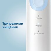 Ця зубна щітка забезпечує догляд відповідно до індивідуальних потреб завдяки трьом режимам. Режим Clean (Чищення) – стандартний режим для відмінною щоденного чищення. White (Освітлення) – ідеальний режим для видалення поверхневих потемніння. Gum Care (Догляд за яснами) – плюс хвилина чистки зі зниженою інтенсивністю для дбайливого масажу ясен.