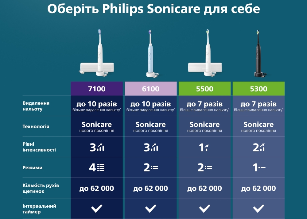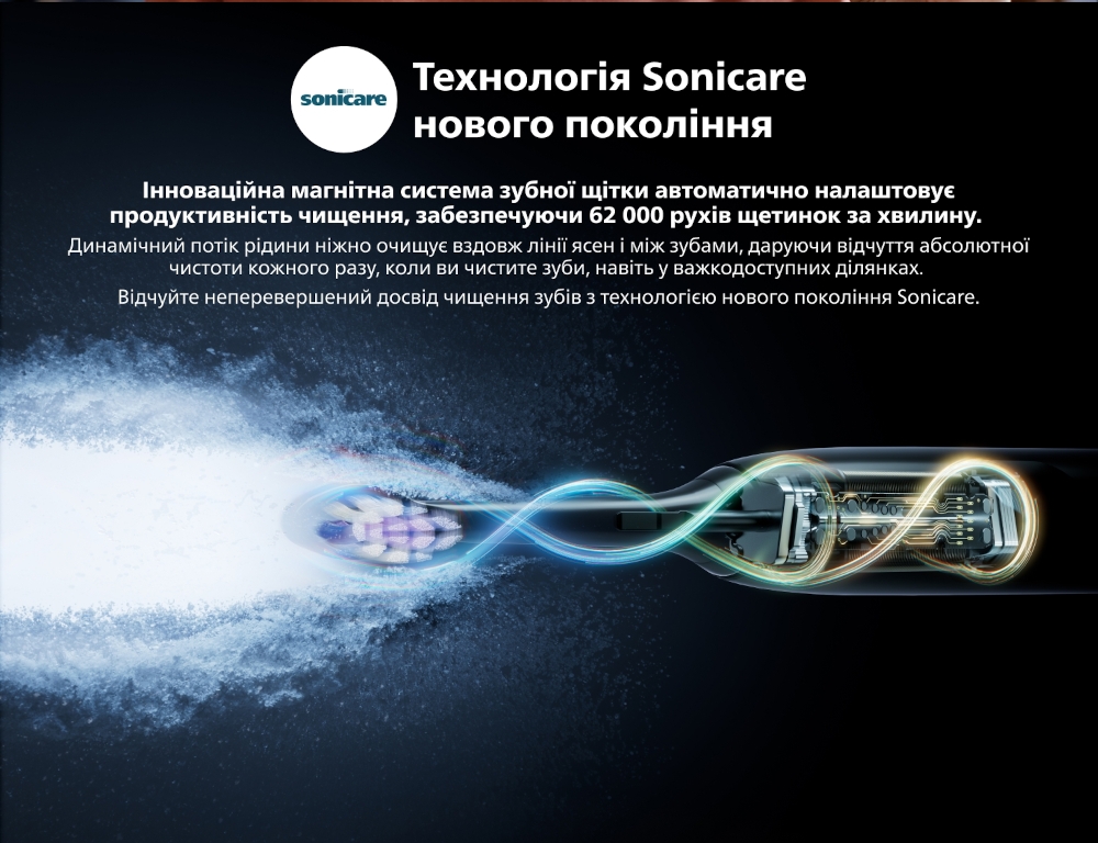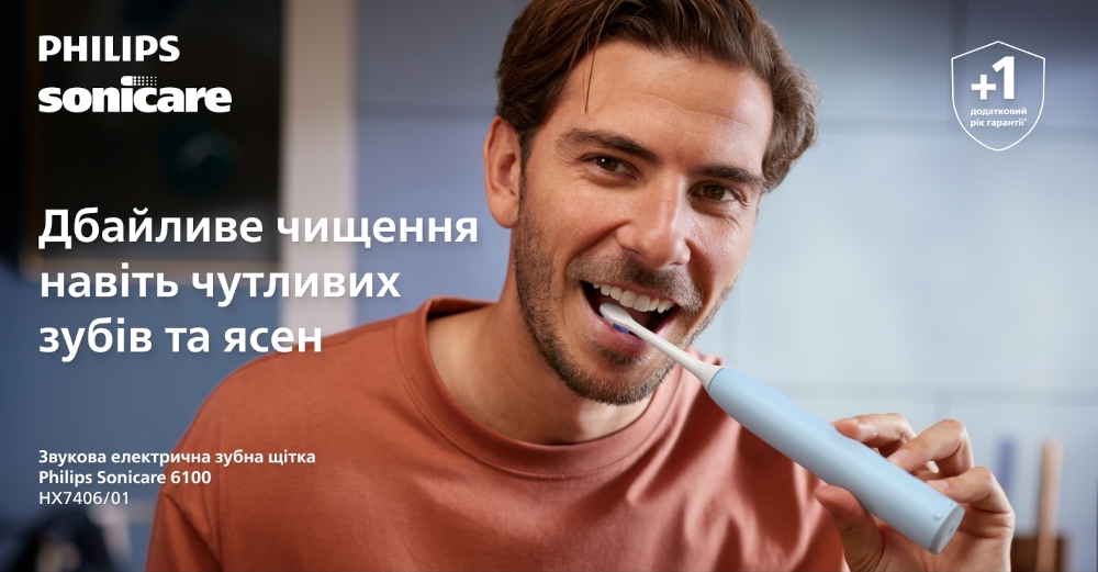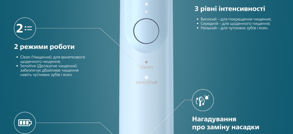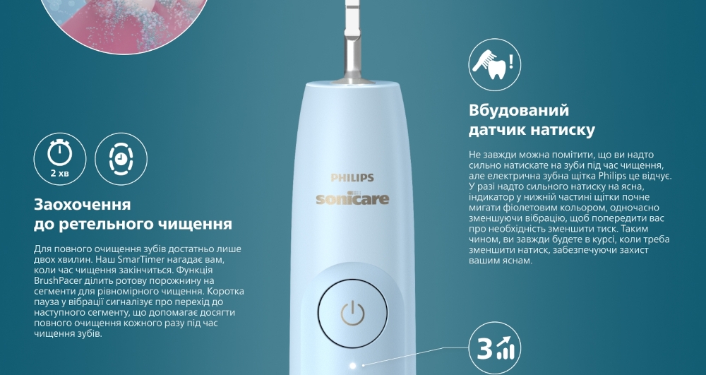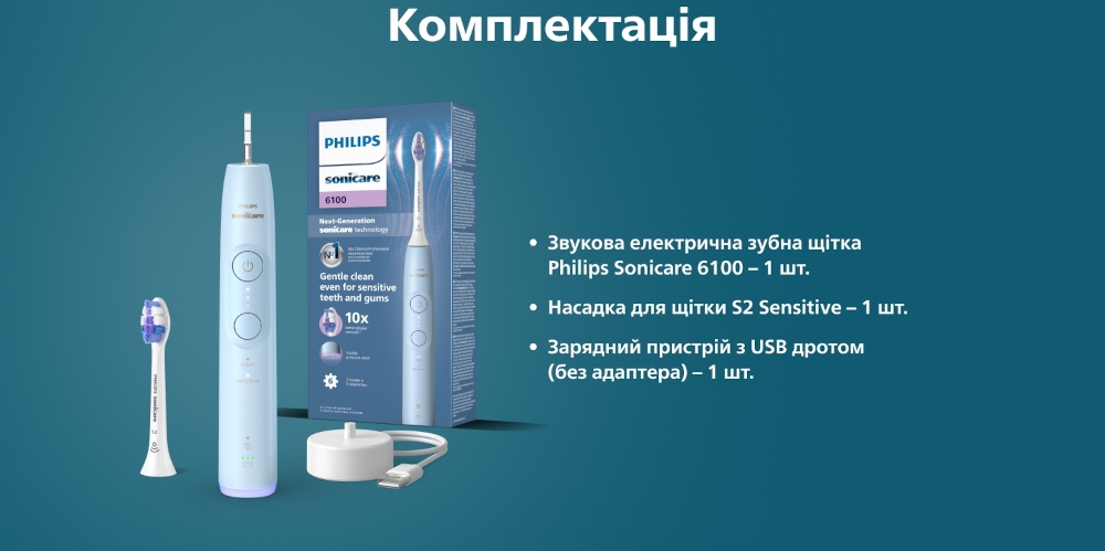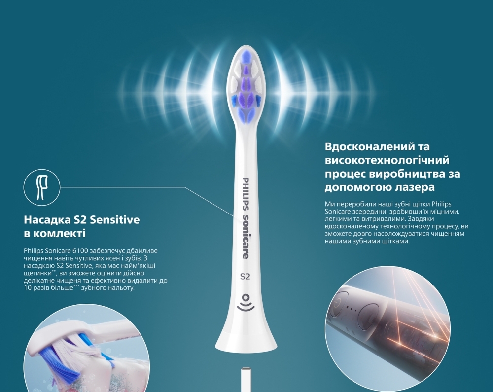 Philips Sonicare 6100 оснащена технологією Sonicare нового покоління, спеціальним режимом Sensitive, насадкою S2 Sensitive та має низьку інтенсивність. А також функцію попередження про надмірну силу тиску.