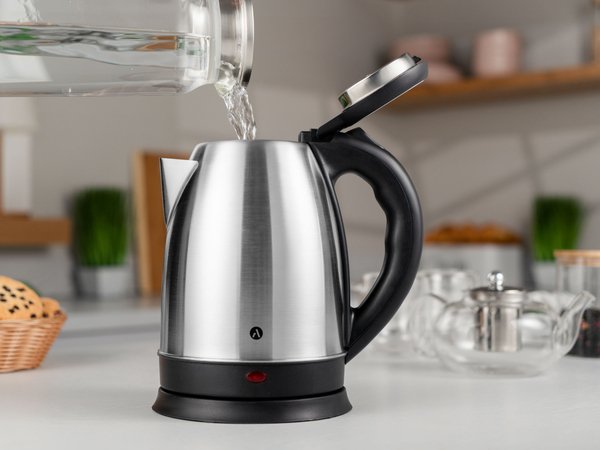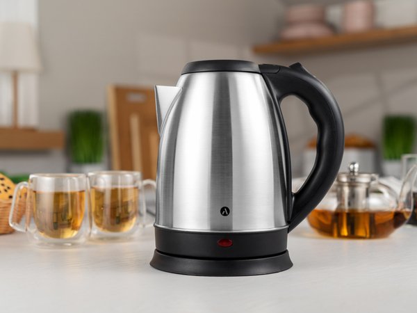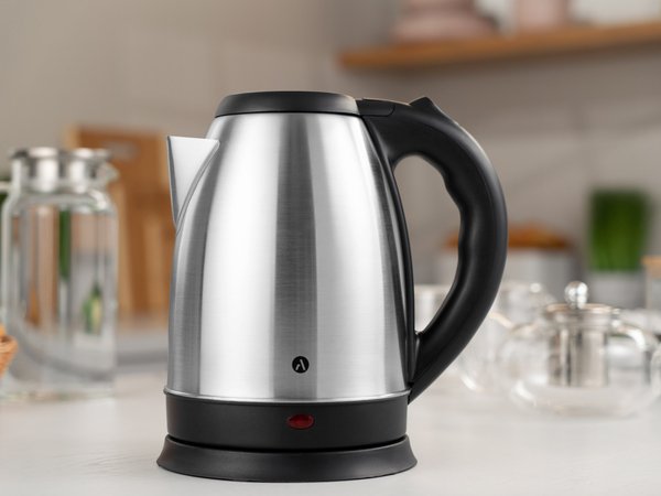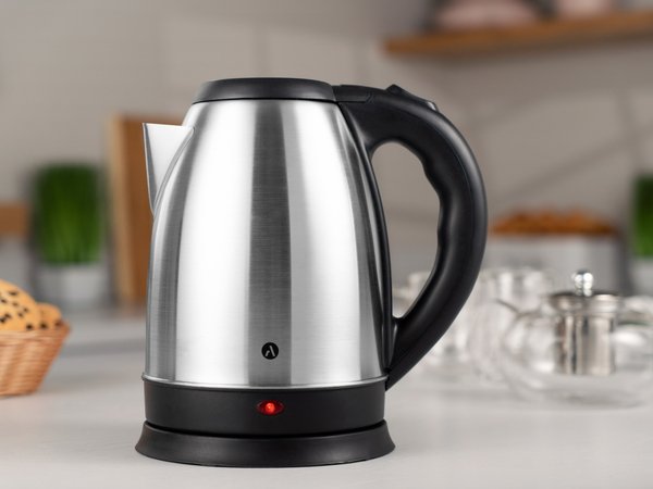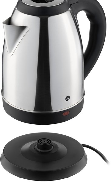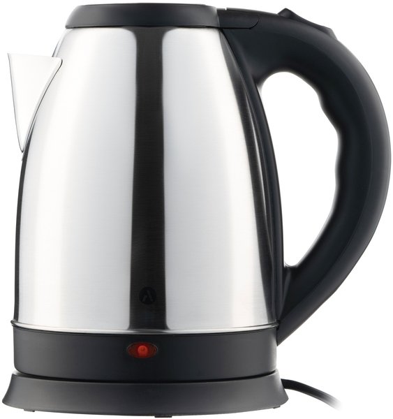 Металевий електрочайник з об`ємом 1,8 літра та підставкою, яка забезпечує оберт на 360°. Матеріал підставки, основи та ручки – полікарбонат чорного кольору. Основна частина чайника виконана з нержавіючої сталі, а під час роботи працює LED-індикація.