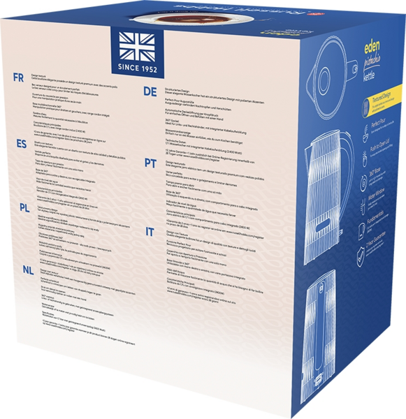 Чайник Eden від Russell Hobbs - це ідеальне поєднання дизайну та продуктивності. Непомітне віконце для води з індикатором кількості води дозволяє економити енергію, закип'ячуючи лише стільки води, скільки вам потрібно. Кришка, що відкривається натисканням, покращена воронка та основа, що обертається на 360°, забезпечують легке наповнення, кип'ятіння та наливання. А оскільки ваш чайник завжди на виду, чому б не мати такий, на який приємно дивитися? Завдяки модному кольору та стильному текстурованому покриттю він чудово виглядатиме на будь-якій кухонній стільниці.