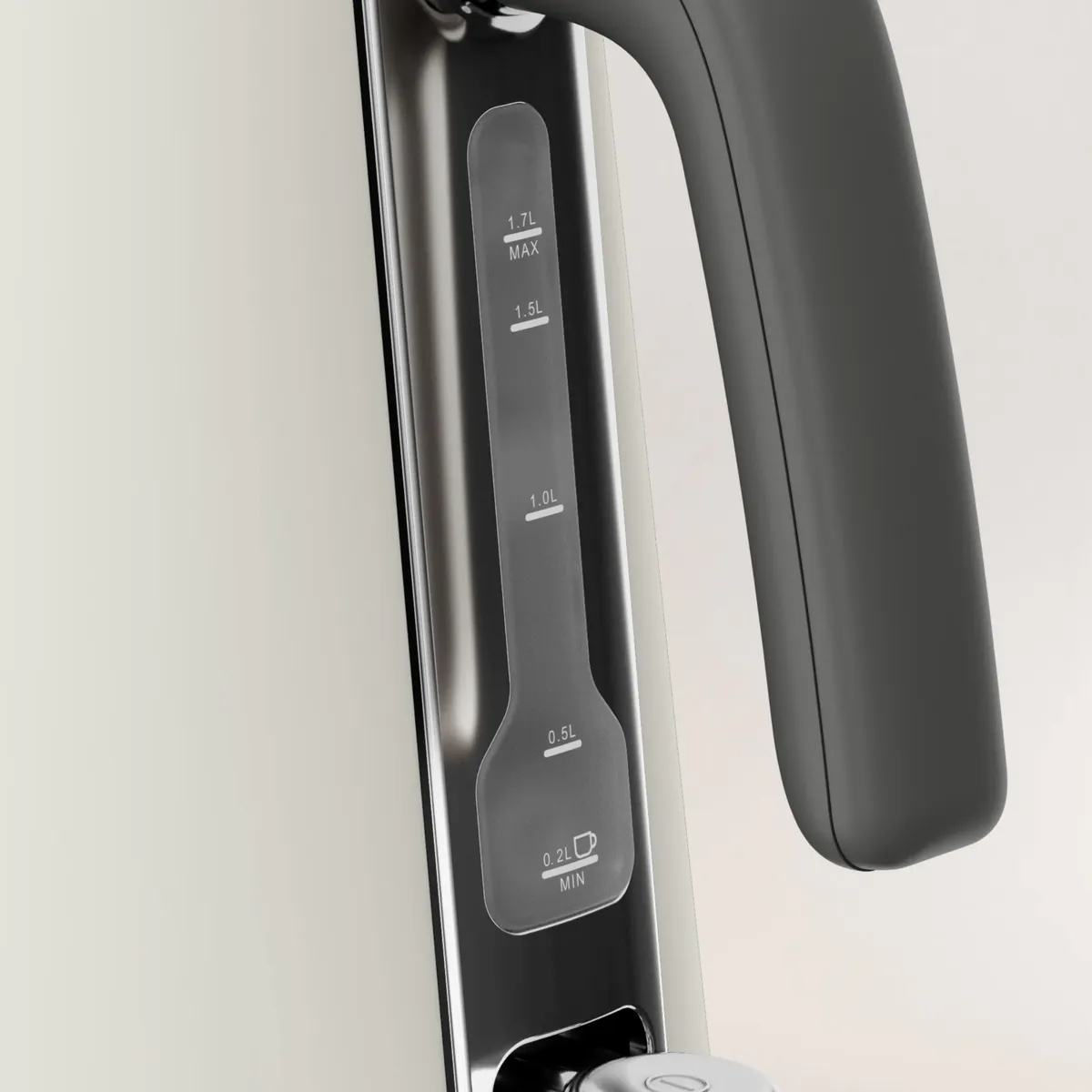 Його стильний корпус із нержавіючої сталі поєднує ретро-естетику з сучасною елегантністю. Завдяки широкому отвору наповнювати та очищувати чайник надзвичайно легко. Вбудоване оглядове віконце з індикатором однієї чашки допоможе точно відміряти потрібну кількість води для приготування улюбленого напою. Потужний та зручний, цей електрочайник має простору місткість і оснащений знімним багаторазовим фільтром проти накипу для легкого очищення.