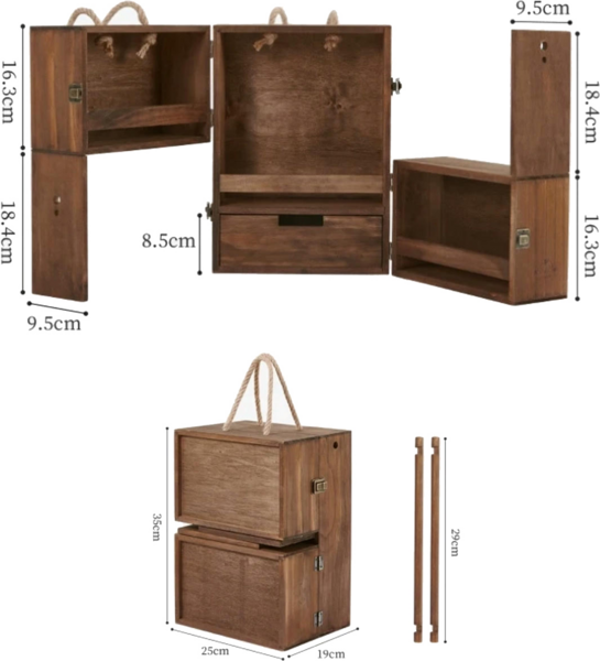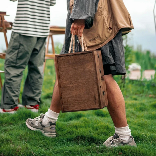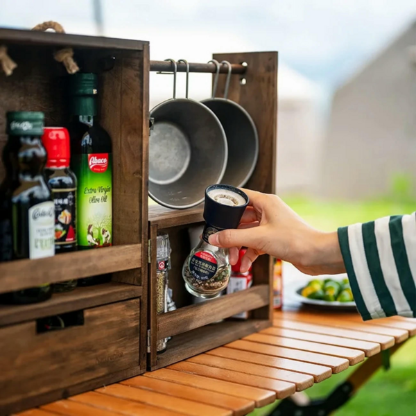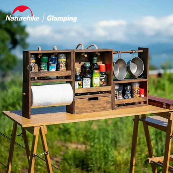Красива і стильна етажерка Naturehike CNH22JU018 виготовлена з сосни. Вона має 3 полички, призначені для зберігання спецій, а також один висувний ящик для зберігання столових приладів. Також вона має підвісні полиці, на яких можна кріпити посуд або рушники, і висувну шухляду для будь-яких дрібниць. Модель швидко і просто складається. Для зручного перенесення в неї передбачені ручки, виготовлені з мотузки, які не впиваються в шкіру навіть під час тривалих походів.