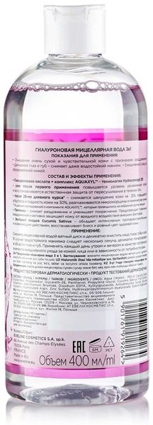 ГІАЛУРОНОВА МІЦЕЛЯРНА ВОДА 3В1 – це відмінний косметичний засіб, призначений для сухої, дуже сухої та чутливої шкіри. Міцелярна вода знімає навіть водостійкий макіяж, ефективно очищає та освіжає шкіру, додатково вона підвищує епідермальні запаси води, стимулює синтез гіалуронової кислоти, розгладжує глибокі зморшки та мімічні лінії завдяки своєму унікальному складу. Додатково, гіалуронова міцелярна вода нормалізує процес відлущування верхнього шару, підвищує пружність шкіри та надає їй шовковистої гладкості та стимулює синтез керамідів у шкірі.