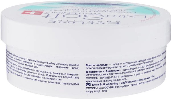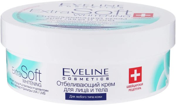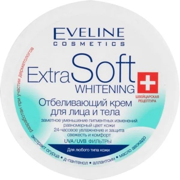 Відбілюючий крем для обличчя та тіла Eveline Cosmetics призначений для усунення наявної пігментації та появи нових проявів. Засіб добре вирівнює тон шкіри, дарує їй свіжий і здоровий вигляд. Крем містить екстракт огірка, що допомагає позбавити шкірний покрив пігментних плям, які з'явилися як внаслідок вікових змін, так і в процесі фотостаріння шкіри. Засіб надає тонізуючий вплив на епідерміс, захищає його від втрати вологи, розгладжує та живить. Спеціальні компоненти крему пом'якшують та заспокоюють шкіру.