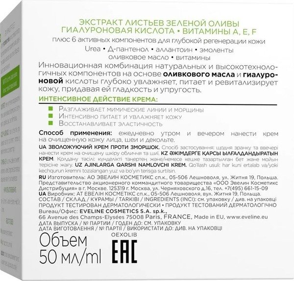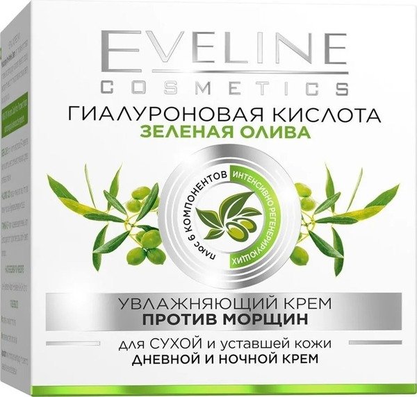 Eveline Cosmetics Крема-6 компонентів:зволожуючий крем проти зморшок для сух.Та висн.Шк гіал.Кис.+зел.Олива 50 мл