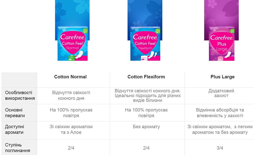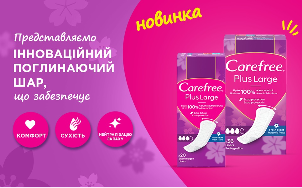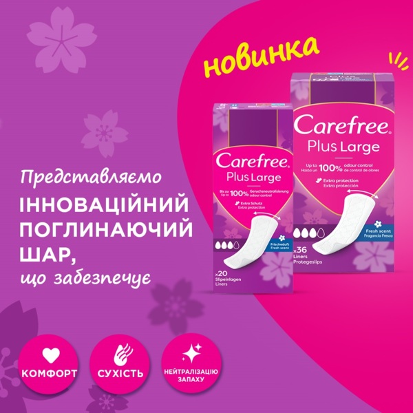 Carefree Plus Large — зручні та надійні щоденні прокладки. Вони ширше й довше звичайних, тому надійно захищають, забезпечують відчуття свіжості та чистоти протягом дня.