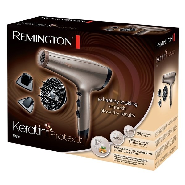 Потужний фен Потужність 2200 Вт Keratin Protect, виконаний в кольорі бронзи і рожевого золота, має грати з керамічним покриттям для швидкого нагріву і рівномірного розподілу тепла і іонний генератор, який виробляє на 90%*більше іонів, запечатує вологу для блиску волосся , без сплутування.