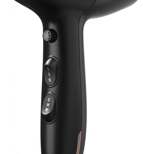 Максимальна потужність пристрою – 2000 Вт, передбачений захист від перегріву і підтримуються дві швидкості з трьома температурними режимами, які можна вибрати за допомогою клавіш керування на ручці. Знімна насадка-концентратор покращує розподіл повітряного потоку, а функція Cool Shot забезпечує більш щадну сушку ослабленого волосся холодним повітрям.