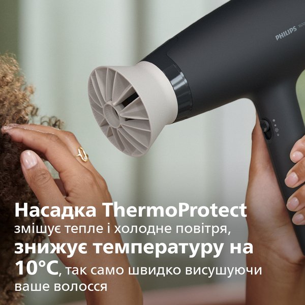 Насадка ThermoProtect з унікальною конструкцією змішує тепле й холодне повітря для дбайливого сушіння волосся. Сушіть волосся швидко навіть при температурі на 10°C нижче.