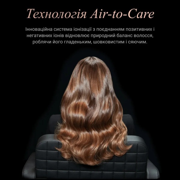 - Технологія Air-to-Care: інноваційна система іонізації з поєднанням позитивних і негативних іонів відновлює природний баланс волосся, роблячи його гладеньким, шовковистим і сяючим.