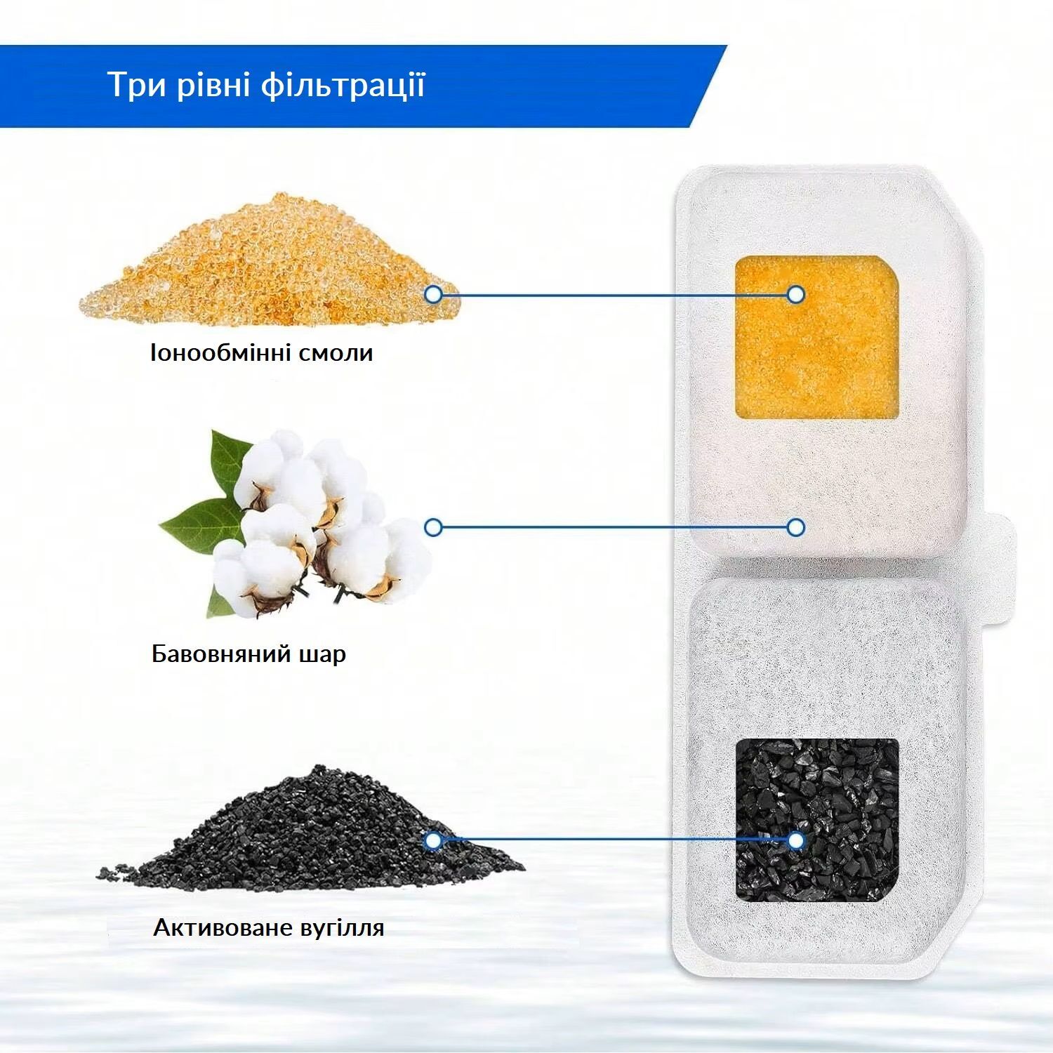 Змінний фільтр для фонтанів забезпечує надійну фільтрацію забруднень питної води, гарантуючи, що ваші тварини завжди мають доступ до чистої та свіжої води. Фільтр виготовлений з екологічно чистих матеріалів, таких як бавовна, кокосове активоване вугілля та іонообмінні смоли. Смоли нормалізують жорсткість води, а кокосове активоване вугілля ефективно видаляє хлор, хлорорганічні сполуки, запахи, присмаки та кольоровість води. Бавовняний шар очищає воду від великих часток, таких як шерсть, залишки корму й пил.