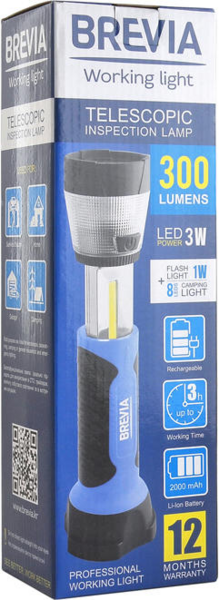 - Ліхтар інспекційний Brevia телескопічний LED 3W COB+1W LED+8LED 300lm 2000mAh адаптер AC 220 (11330)