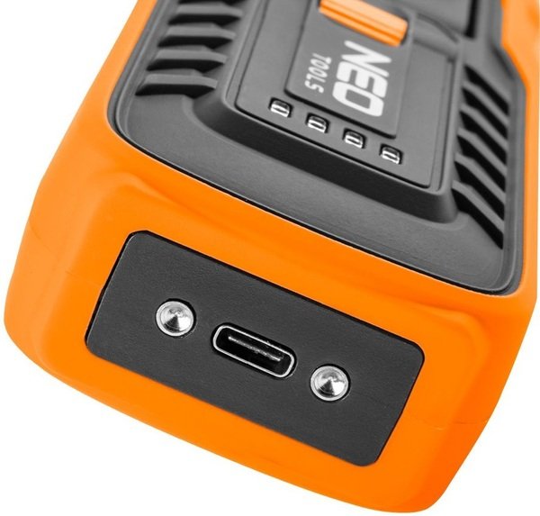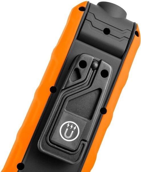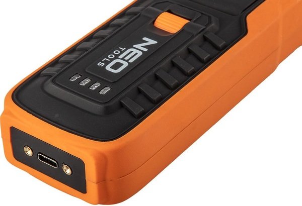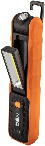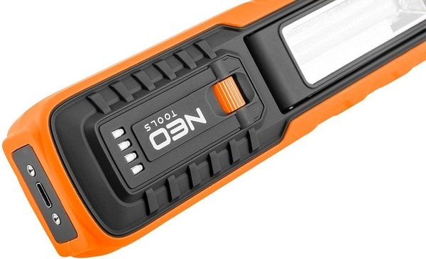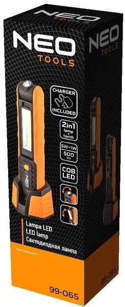 Акумуляторний ліхтар Neo Tools 99-065 оснащений світлодіодом COB зі світловим потоком 500 люмен і потужністю 5Вт+1Вт. Завдяки вбудованій рухомій голівці може використовуватися як лампа і як ліхтарик. Він живиться від доданої літій-іонної батареї 3.7 з місткістю 2600 мАг. Зарядка здійснюється за допомогою зарядної бази, яка також є підставкою, що утримує його у вертикальному положенні. Лампу можна повісити на вбудований гачок або зафіксувати магнітом. Відповідність європейським стандартам безпеки підтверджено сертифікатом CE.