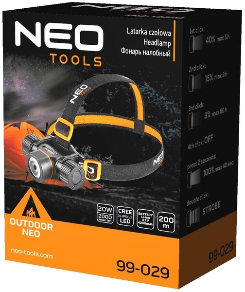 Потужний (2000 люмен) лобовий ліхтар NEO оснащений висококласним світлодіодом LED CREE XP50.2 потужністю 20Вт. Корпус виконаний з алюмінію. Ліхтар має 5 функцій освітлення 100%/40%/15%/3%/стробоскоп. Фару можна зняти з корпусу та використовувати як ліхтарик. Ліхтар поставляється з обручем на голову. Має широкий спектр застосування, у тому числі в майстерні, для електрика, сантехніка, під час поїздок, під час занять спортом тощо. Відповідність європейським стандартам безпеки підтверджено сертифікатом CE.
