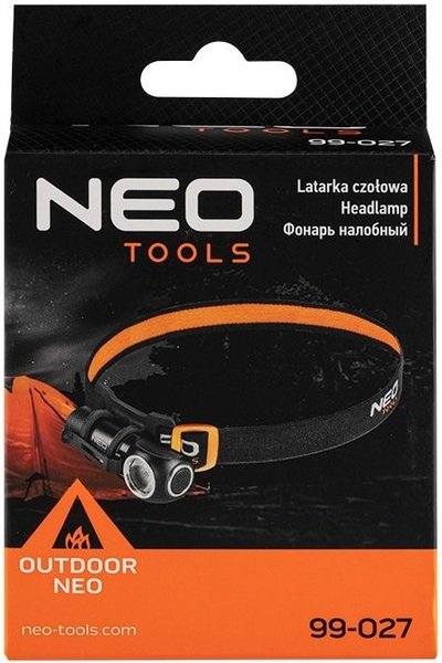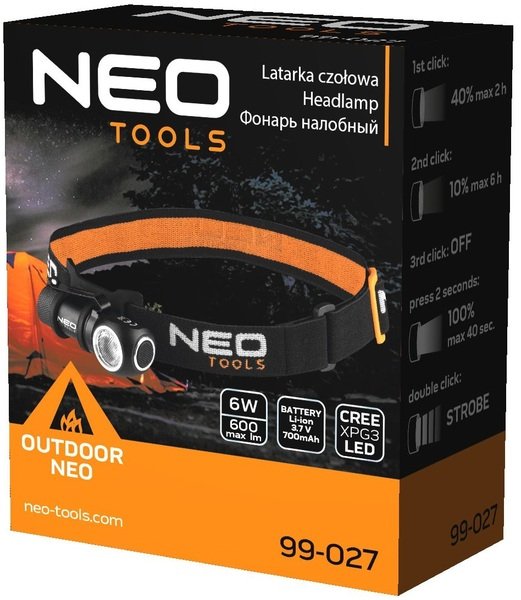 Потужний (600 люмен) налобний ліхтар NEO оснащений висококласним світлодіодом LED CREE XPG3 потужністю 6Вт. Корпус виконаний із алюмінію. Ліхтар має 4 функції освітлення 100%/40%/10%/стробоскоп. Фару можна зняти з корпусу та використовувати як ліхтарик. Ліхтар поставляється з обручем на голову. Має широкий спектр застосування, у тому числі в майстерні, для електрика, сантехніка, під час поїздок, під час занять спортом тощо. Відповідність європейським стандартам безпеки підтверджено сертифікатом CE.
