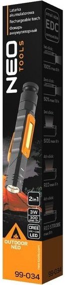Ручний кишеньковий ліхтарик NEO відрізняється міцною конструкцією, оснащений світлодіодом LED CREE XPE+COB зі світловим потоком 300 люмен та потужністю 3Вт. Ліхтарик має 5 функцій освітлення: ліхтарик 100% / ліхтарик 50% / бічне світло 100% / бічне світло червоне / бічне світло червоний стробоскоп. Продукт має широкий спектр застосування, наприклад, вдома, в машині, в підвалі, кемпінгу. Відповідність європейським стандартам безпеки підтверджується сертифікатом CE.