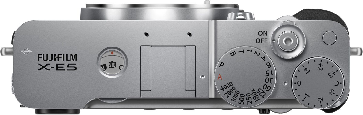 Вдосконалення є центральним елементом кожного аспекту дизайну Fujifilm X-E5. Наприклад, видошукач і регулятор діоптрійного коригування врівень з корпусом, а кнопка Bluetooth на базовій пластині нагадує кнопку перемотування на класичній плівковій камері.