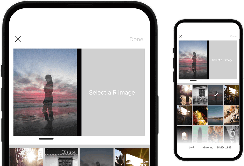 Лише кілька дотиків перетворять вертикальні зображення на шедеври 2-в-1. Вибирайте улюблені кадри, міняйте їх місцями, налаштовуйте колір та розмір розділювальної лінії - ви можете керувати кожною деталлю.
