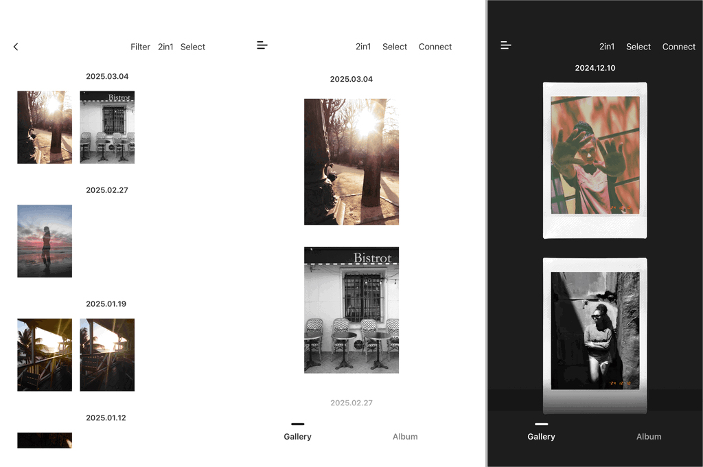 Додаток X half - це ваша персональна галерея, яку ви можете оформити так, як вам подобається. Виберіть один з двох кольорів фону та один з шести стилів рамок, щоб показати ваші зображення в найкращому вигляді.