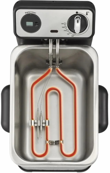 Фритюрниця оснащена кришкою з оглядовим віконцем і металевим фільтром, а кошик має позицію для зливання олії прямо в чашу після смаження.