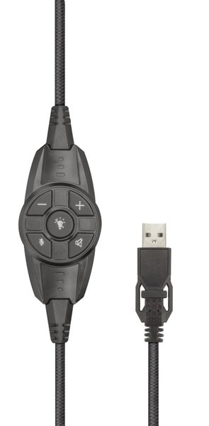 Віртуальний об'ємний звук 7.1 забезпечує створення ефекту реалістичного звуку. Потужні активні динаміки з діаметром гучномовця 40 мм. Плавні світлові ефекти RGB-ламп в обох навушниках. Вбудований модуль з кнопками керування рівнем гучності/освітлення та вимкненням мікрофона. Гнучка мікрофонна штанга зі світлодіодним індикатором вимкнення мікрофона. Зручні та великі накладні амбушюри. Навушники з можливістю обертання та регульована дужка. Плетений кабель завдовжки 2 м із USB-портом.