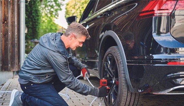 З пневматичним ударним гайковертом Einhell заміна шин також може бути легкою. Потужний ударний гайковерт досягає моменту відкручування і закручування до 610 Нм при максимальному робочому тиску 8 бар. Ударний гайковерт вагою 1,14 кг є приналежністю компресора. Він працює на холостому ходу зі швидкістю до 9000 об/хв і споживає 142 літри повітря на хвилину.