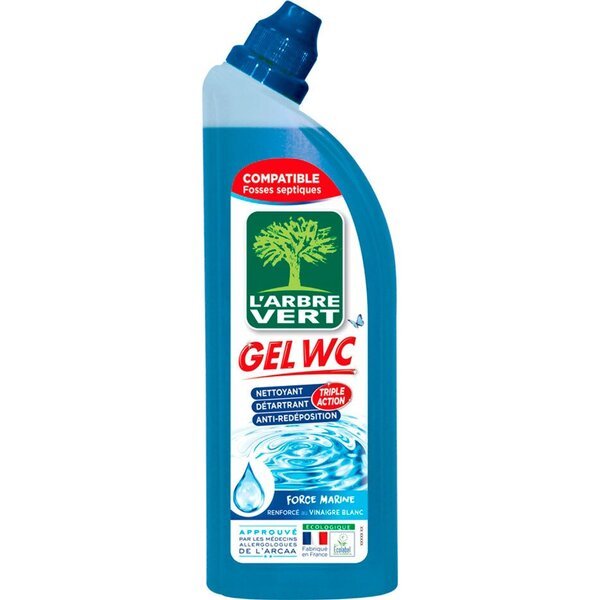 Гель для чищення унітазів L'Arbre Vert з ароматом морської свіжості спеціально розроблений для регулярного догляду за унітазами та пісуарами. Його натуральна формула проти повторного відкладення запобігає та усуває накип і бруд. Аромат лаванди та евкаліпта залишає ніжний аромат чистоти. Він схвалений алергологами Асоціації клінічних досліджень алергології та астми (ARCAA).