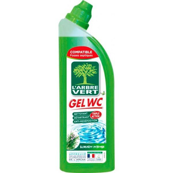 Гель для чищення унітазів L'Arbre Vert с запахом розмарина спеціально розроблений для регулярного догляду за унітазами та пісуарами. Його натуральна формула проти повторного відкладення запобігає та усуває накип і бруд. Аромат лаванди та евкаліпта залишає ніжний аромат чистоти. Він схвалений алергологами Асоціації клінічних досліджень алергології та астми (ARCAA).
