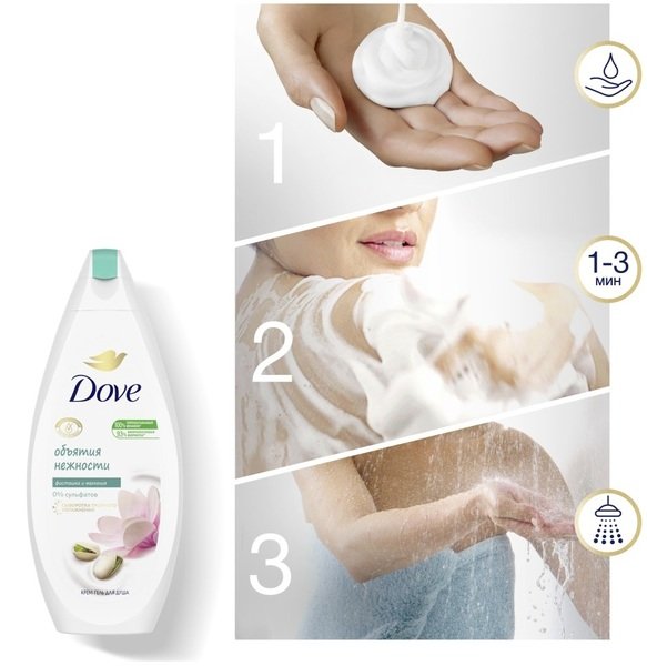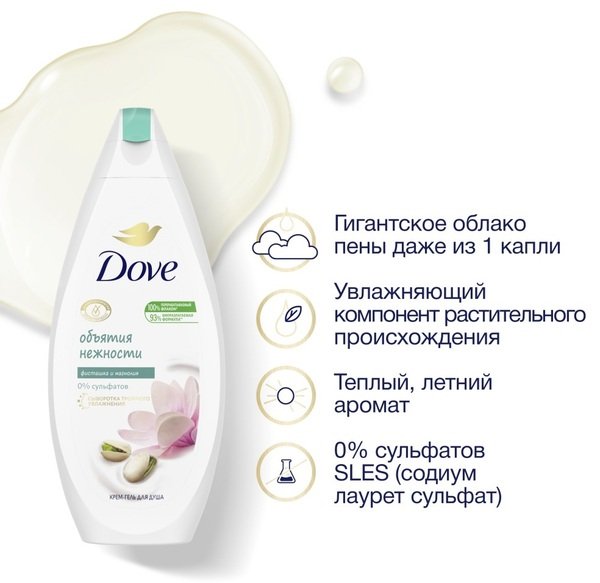 Формула крем-гелю для душу «Фісташковий крем і магнолія» Dove - це поєднання делікатного очищувального засобу і ніжного крему в одному флаконі. Компоненти його складу підтримують здоров'я і тонус шкіри, насичують вологою, роблять її гладенькою і м'якою. Навіть через деякий час після водних процедур ви зможете відчувати дивовижний аромат крем-гелю для душу Dove.