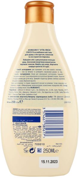 - Гель для душу Johnson's Vita-Rich Розслаблюючий з йогуртом кокосом та екстрактом персика 250мл