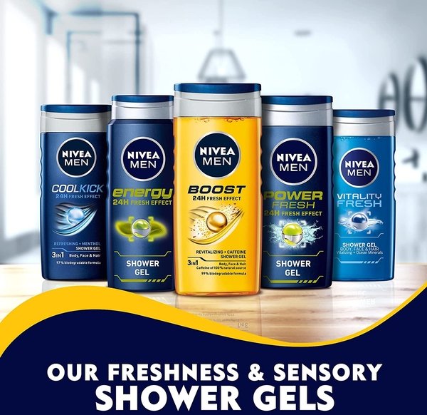 Натуральний кофеїн + свіжий аромат = заряд енергії на весь день! Ідеально підходить для тіла, волосся та обличчя, пробуджуючи кожний міліметр вашої шкіри. Зарядись енергією з гелем для душу Boost від NIVEA MEN! Турбуйся про планету разом з NIVEA MEN: формула цього гелю для душу є біорозкладною та не містить мікропластик.